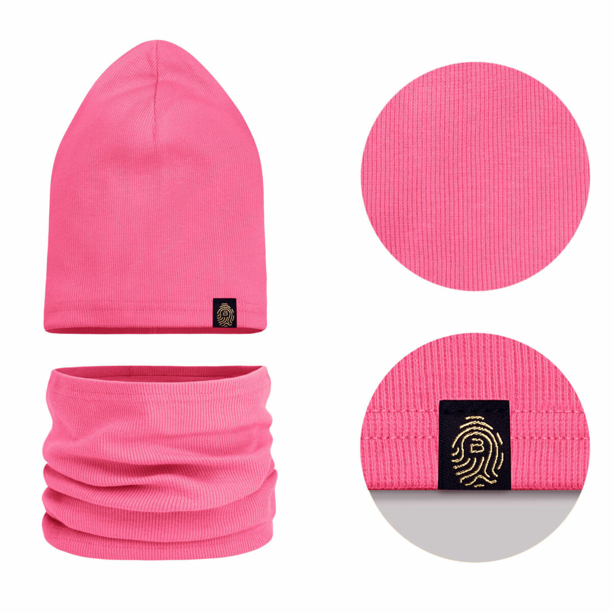 Oto praktyczny i pełen uroku komplet dla młodej damy lub dżentelmena. Uprzyjemni wiosenne i jesienne spacery oraz zabawy na świeżym powietrzu. Modny zestaw składa się z czapki oraz komina, w pięknym żywym odcieniu. Całość została wykonana z miękkiej i miłej w dotyku, jednowarstwowej bawełny o delikatnie prążkowanej fakturze. Materiał posiada atest i jest w pełni bezpieczny dla skóry dziecka.